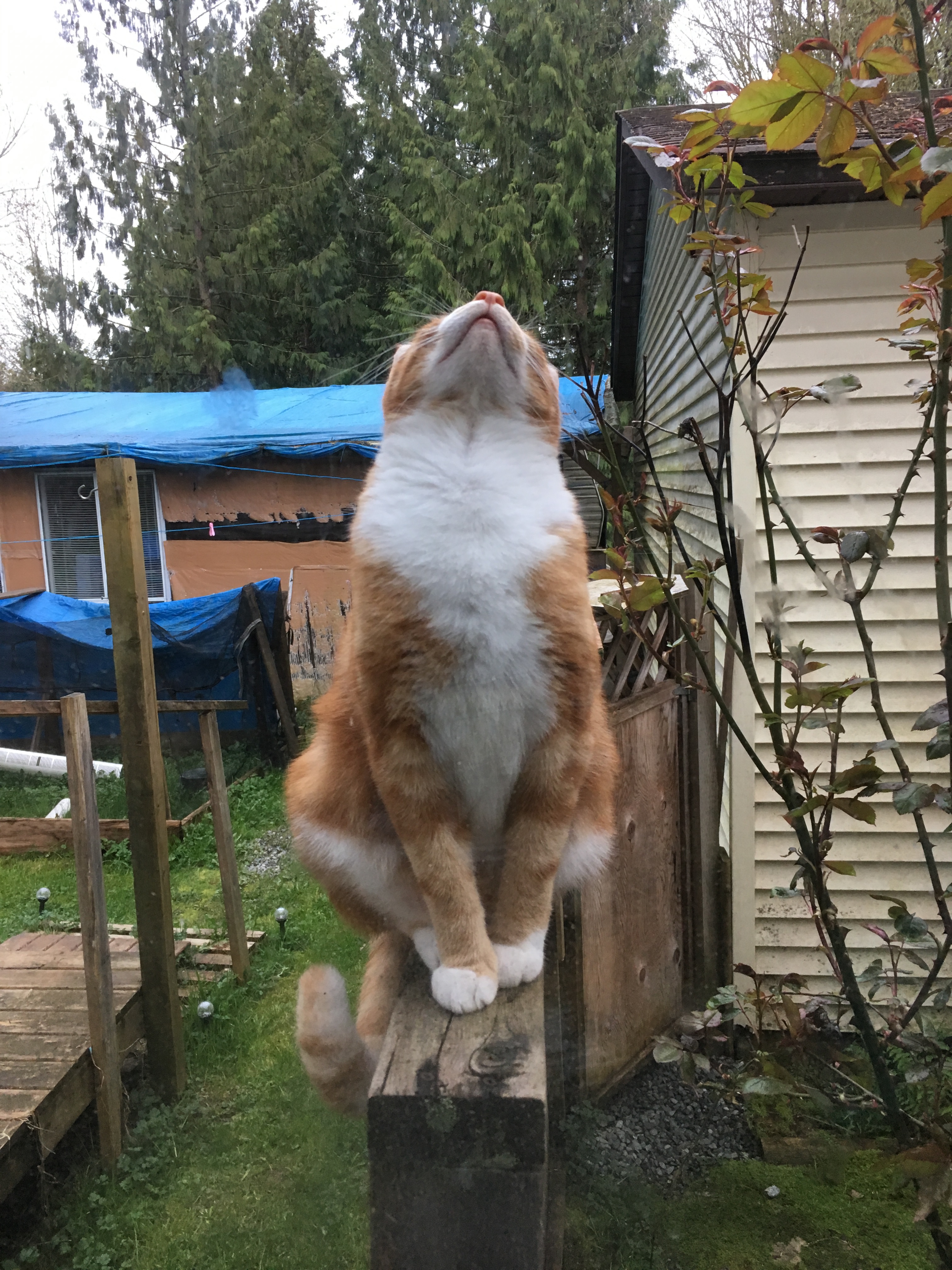 Looking up above at a wet grey sky,